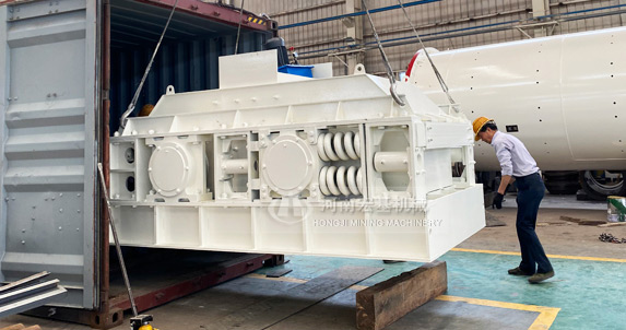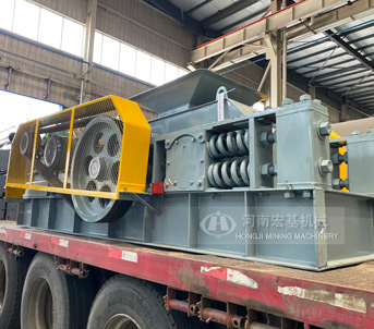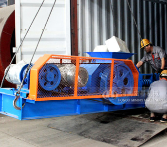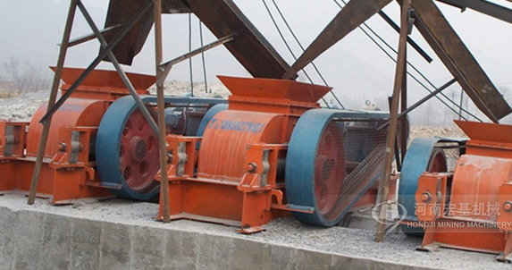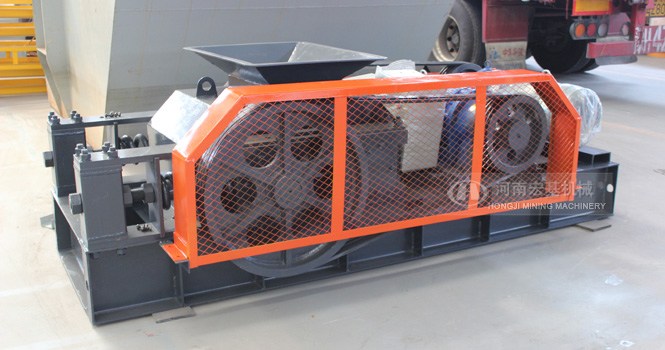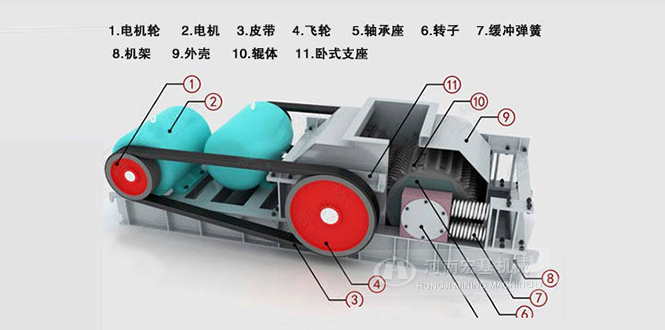 出料粒度的調(diào)節(jié):兩輥輪之間裝有楔形或墊片調(diào)節(jié)裝置,楔形裝置的頂端裝有調(diào)整螺栓,當調(diào)整螺栓將楔塊向上拉起時,楔塊將活動輥輪頂離固定輪,即兩輥輪間隙變大,出料粒度變大,當楔塊向下時,活動輥輪在壓緊彈簧的作用下兩輪間隙變小,出料粒度變小。墊片裝置是通過增減墊片的數(shù)量或厚薄來調(diào)節(jié)出料粒度大小的,當增加墊片時兩輥輪間隙變大,當減少墊片時兩輥輪間隙變小,出料粒度變小。驅(qū)動機構(gòu)是由兩個電動機,通過三角皮帶傳動到槽輪上拖動輥輪,按照相對方向運動旋轉(zhuǎn)。在破碎物料時,物料從進料口通過輥輪,經(jīng)碾壓而破碎,破碎后的成品從底架下面排出。