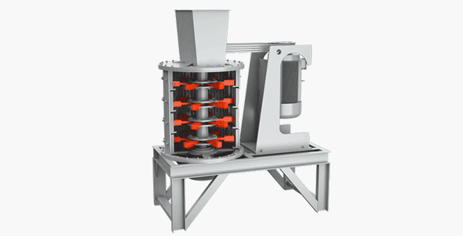 物料由機(jī)器上部垂直落入高速旋轉(zhuǎn)的葉輪內(nèi),在高速離心力的作用下,與另一部分以傘狀形式分流在葉輪四周的物料產(chǎn)生高速撞擊與粉碎,物料在互相撞擊后,又會(huì)在葉輪和機(jī)殼之間以物料形成渦流多次的互相撞擊、摩擦而粉碎,從下部直通排出,形成閉路多次循環(huán),由篩分設(shè)備控制達(dá)到所要求的成品粒度。