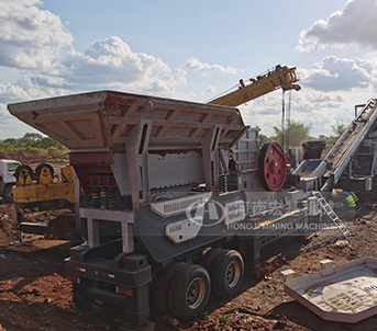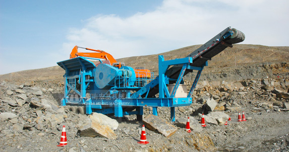 移動(dòng)顎式破碎機(jī)工作時(shí),先由鏟車將物料裝入稱動(dòng)破碎機(jī)的給料設(shè)備,由給料設(shè)備均勻的將物料輸送至破碎單元模塊,破碎后再由輸送模塊輸送至篩分模塊,篩選出合格的物料輸送至成品物料堆方區(qū)進(jìn)行儲(chǔ)存。